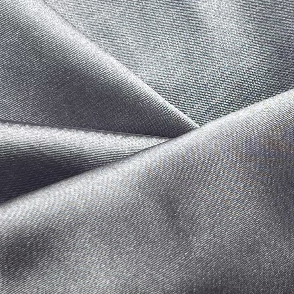 Comfort and Hand-Feel Dual lustrous texture, stretch flexibility & skin-friendly performance: The seamless integration of the exquisite satin weave structure, twisted polyester yarn and spandex blend endows the fabric with a unique bright lustrous finish and excellent 4-way stretch performance. This lustrous surface presents an elegant and luxurious texture that perfectly aligns with the aesthetic demands of modern high-end apparel. Simultaneously, the inner layer of the fabric undergoes special treatment to form a gentle and delicate texture, which effectively eliminates friction between the fabric and the skin, avoiding discomfort such as redness or irritation caused by prolonged contact. When worn, the fabric fits closely to the body’s curves with flexible stretch, creating a comfortable wrapping sensation—whether during daily activities like walking and sitting, or dynamic movements such as stretching and bending, it will not cause any tightness or constraint. In terms of wearing applicability, the fabric’s medium weight (90-120g/m²), excellent breathability and stretch performance make it suitable for all-day wear across four seasons: in spring and autumn, it can be used as outerwear to provide appropriate warmth and comfort; in summer, its superior breathability and moisture-wicking ability keep the skin dry and cool; in winter, it can serve as a close-fitting inner lining that adds no bulk while maintaining skin comfort and flexible fit. Furthermore, the fabric has passed rigorous skin-friendly tests, and its mild texture makes it safe for daily wear by individuals with sensitive skin.